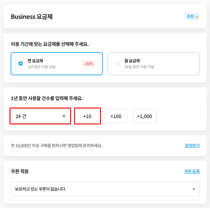 Q. 100건 단위로 구매해야 하나요?A. 아닙니다. 최소 건수는 10건입니다.최소 구매 건수는 10건이며, 고객님께서 희망하시는 건수로 구매 가능합니다. ex) 12건, 2004건 등만 건 이상 구매를 원하시는 경우, 별도로 문의 주시기 바랍니다.(추가 할인 제공)
