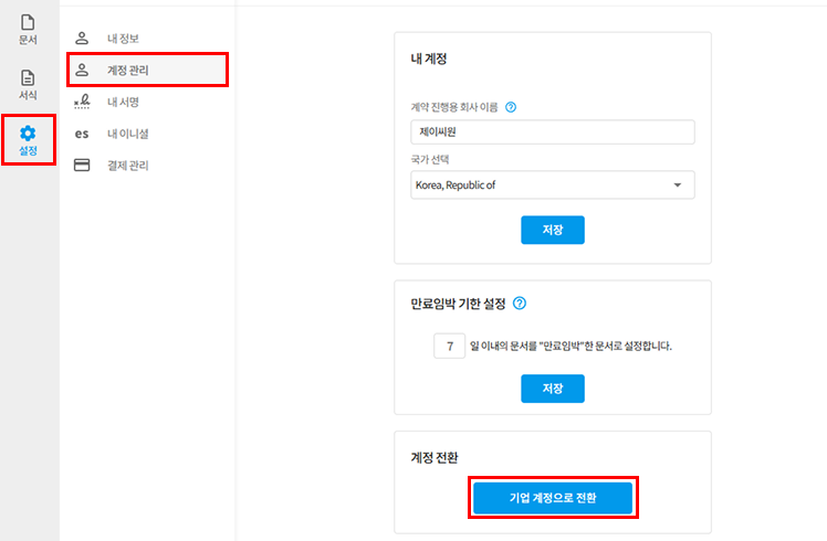 설정 → 계정 관리 → 기업 계정으로 전환이 가능합니다.